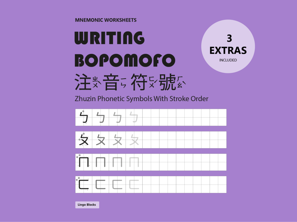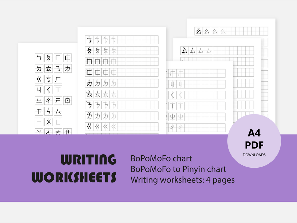 Bopomofo Writing Pack (4 writing worksheets, stroke order reference, Bopomofo to Pinyin chart, and writing template) | 注音符號練習 | ㄅㄆㄇ 練習