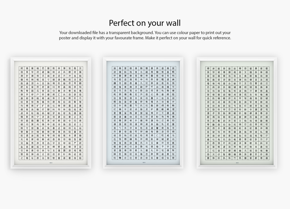 The Characters Only design includes 3 pages, each page presents you with all 300 simplified Chinese characters from each level of the intermediate stage. They are organized based on the official document (published on http://www.moe.gov.cn/jyb_xwfb/gzdt_gzdt/s5987/202103/W020210329527301787356.pdf). You can use it as a tool to help you familiarise yourself with Chinese characters. Or you can print and display it in the place where you like to learn Chinese.