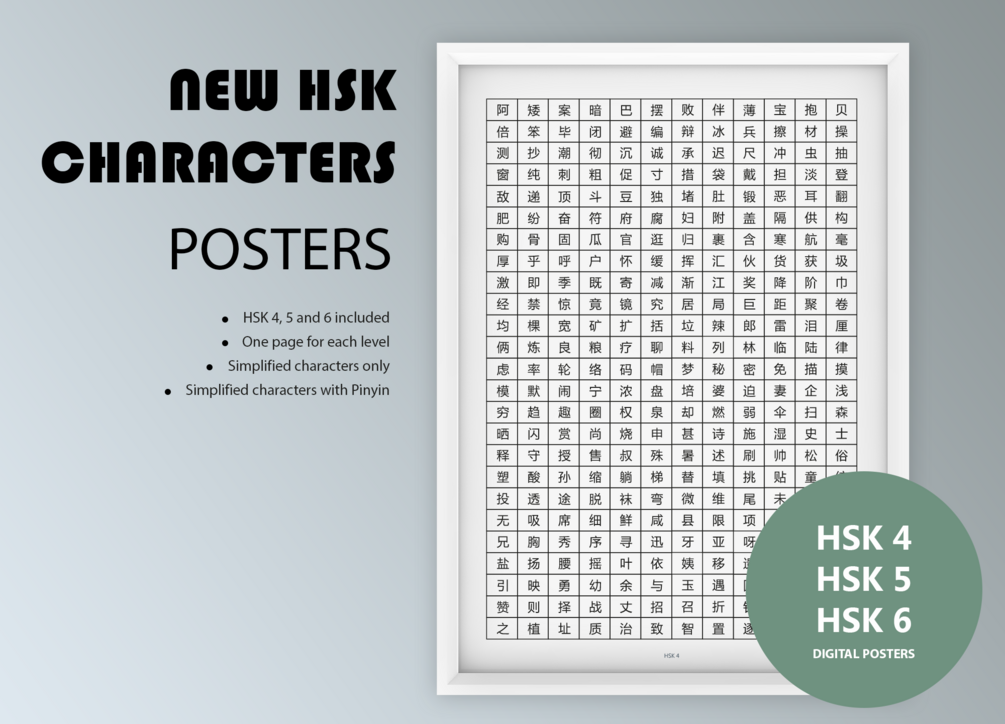 New HSK Simplified Chinese Character Poster Pack for Level 4, 5 and 6 (characters only and characters with Pinyin designs) | 汉语水平考试汉字列表 (简体)